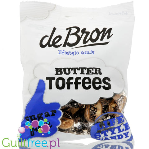 Additional information: De Bron Butter Toffee sugarfree - sugar-free butter toffee caramels with sweeteners This product contains 30% fewer calories than products sweetened with traditional sugar. This product has no added sugar. It contains 0.6g of naturally occurring sugars per 100g of product.