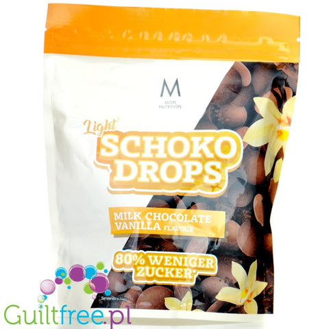 More Nutrition Schoko Drops Milk Chocolate Vanilla are drops of vanilla milk chocolate without added sugar, they have as much as 80% less calories than comparable conventional baking additives containing sugar.