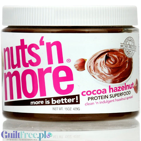 Meet Nuts 'N More Hazelnut Cocoa - a hazelnut butter that combines exceptional taste and functionality. It's more than just ordinary butter - it combines the intense aroma of hazelnuts with the rich taste of dark chocolate. Enriched with whey protein isolate (WPI), which provides complete protein with all essential amino acids and BCAAs, makes this product an ideal choice for physically active people and those concerned with a balanced diet.