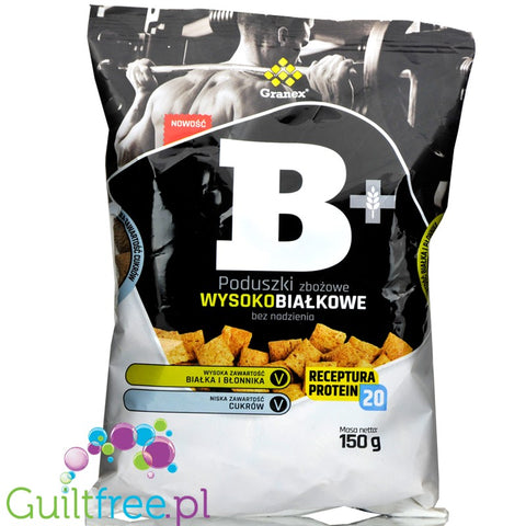 B + to wyjątkowe wysokobiałkowe płatki śniadaniowe, produkt w formie poduszek bez nadzienia. Jest to produkt dla kobiet i mężczyzn w każdym wieku, można go również podawać dzieciom. Dla osób trenujących stanowi doskonały pomysł na śniadanie, przekąskę lub zamiennik posiłku