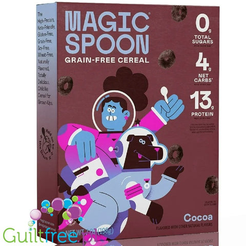 Informacje dodatkowe: Magic Spoon Cocoa Cereal - niskowęglowodanowe płatki śniadaniowe bez glutenu i bez dodatku cukru, o smaku czekoladowym, zawierają substancje słodzące