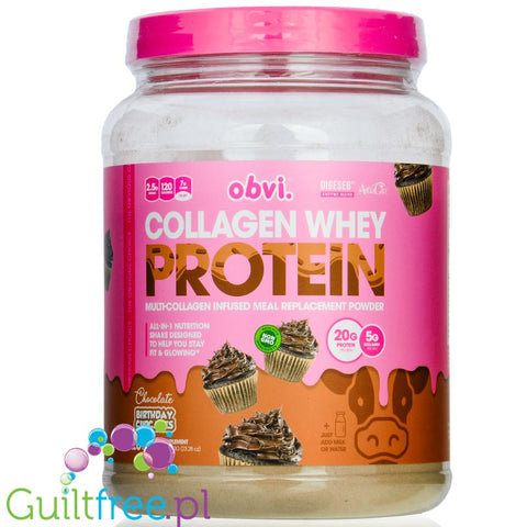 Obvi Collagen Protein Chocolate Birthday Cupcakes to unikatowe połączenie białka serwatkowego i kolagenowego w formie bogatej formuły o właściwościach substytutu posiłku odpowiedniego dla osób. na diecie ketogenicznej. Jedna porcja dostarcza 20g białka w 120kcal, zawiera kompleks witamin i minerałów oraz ekstrakty roślinne wspomagające trawienie i metabolizm, w tym ekstrakt zielonej kawy i ketony malinowe.