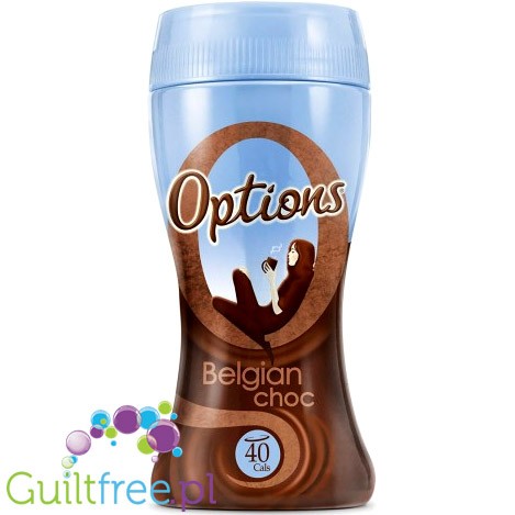 Informacje dodatkowe: Options Belgian Choc - belgijska czekolada do picia o obniżonej kaloryczności (zawiera 5 razy mniej kalorii w porcji 220ml niż tradycyjna gorąca czekolada) Masa netto 198g (18 porcji) Produkt odpowiedni dla wegetarian. Produkt nie zawiera glutenu.