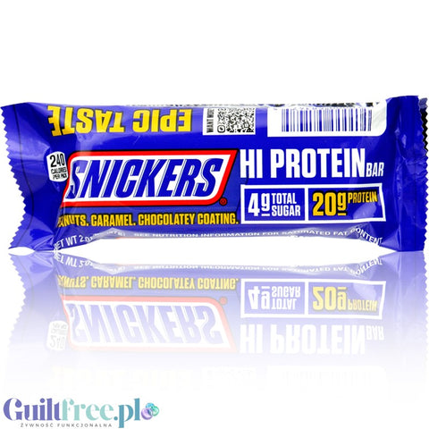 Informacje dodatkowe: Snickers Hi Protein Peanut Caramel & Chocolatey Coating Bar - baton o niskiej zawartości cukru i wysokiej zawartości białka, z orzeszkami ziemnymi i karmelem, w czekoladzie mlecznej z cukrem i substancją słodzącą